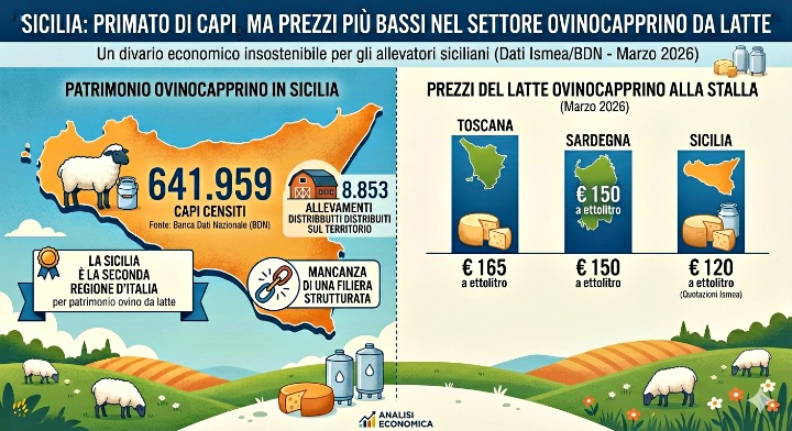 Numeri che raccontano uno squilibrio strutturale, prima ancora che di mercato. La Sicilia si presenta come la seconda regione d’Italia per patrimonio ovino da latte — 641.959 capi censiti dalla Banca dati nazionale, 8.853 allevamenti distribuiti su un territorio che non ha mai davvero costruito una filiera — eppure spunta il prezzo più basso tra le regioni vocate: 120 euro a ettolitro nelle quotazioni Ismea di marzo 2026, contro i 150 della Sardegna e i 165 della Toscana. Un divario di 45 euro rispetto all’isola sorella, insostenibile per chiunque debba fare i conti a fine mese.